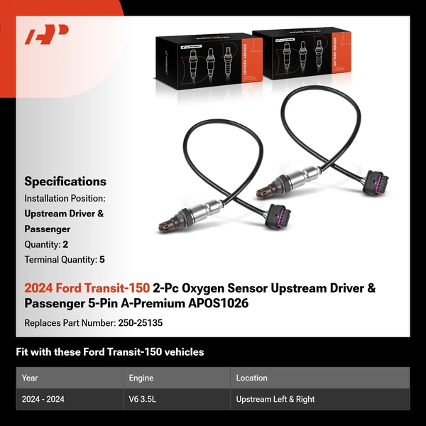 【Note-1】2018-2021 Mustang Upstream Left Bank 2 Sensor 1. Upstream Right Bank 1 Sensor 1. 【Note-2】For 2018-2023 Mustang, fit the model with Manual Transmission, not Automatic Transmission. 【Note-3】For Transit-150 & Transit-250 & Transit-350, fit AWD(All Wheel Drive) only, not RWD (Rear Wheel Drive).