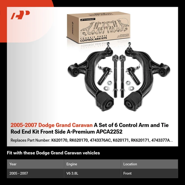 2005-2007 Dodge Grand Caravan A Set of 6 Control Arm and Tie Rod End Kit Front Side A-Premium APCA2252