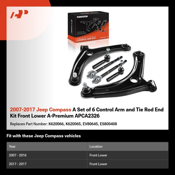 2007-2017 Jeep Compass A Set of 6 Control Arm and Tie Rod End Kit Front Lower A-Premium APCA2326