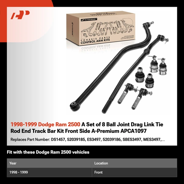 1998-1999 Dodge Ram 2500 A Set of 8 Ball Joint Drag Link Tie Rod End Track Bar Kit Front Side A-Premium APCA1097