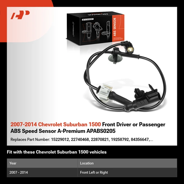 High quality A-Premium aftermarket parts - ABS Speed Sensor A-Premium offers a 3-Year unlimited mileage warranty on our expertly engineered ABS Speed Sensor Replacement for cars. Get the perfect car ABS Speed Sensor match for your vehicle by using our Vehicle Selector.