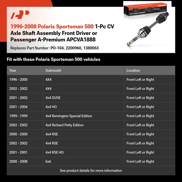 A-Premium Aftermarket CV Axle Shaft: Ideal for Trucks, Cars, and VansA-Premium CV Axle Shaft is designed to meet the unique demands of trucks, cars, and vans. Our expertly crafted replacements come with a 2-Year unlimited mileage warranty, guaranteeing reliability across a wide range of vehicles. Use our Vehicle Selector to find the right CV Axle Shaft for your needs.