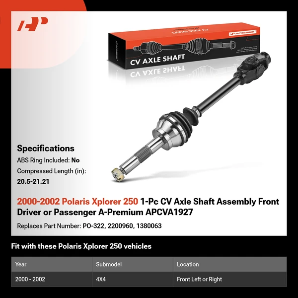 High quality A-Premium aftermarket parts - CV Axle Shaft A-Premium offers a 2-Year unlimited mileage warranty on our expertly engineered CV Axle Shaft Replacement for cars. Get the perfect car CV Axle Shaft match for your vehicle by using our Vehicle Selector.